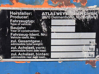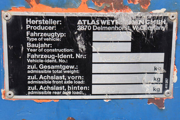Brand: Atlas Type: 1004 Serial number: 104M32149 Year of construction: 1989 Fuel: Diesel Engine power: 35 kW Quick change: No Operating hours read: 7696 h Machine weight: 9000 kg Chassis: Wheels Color: blue