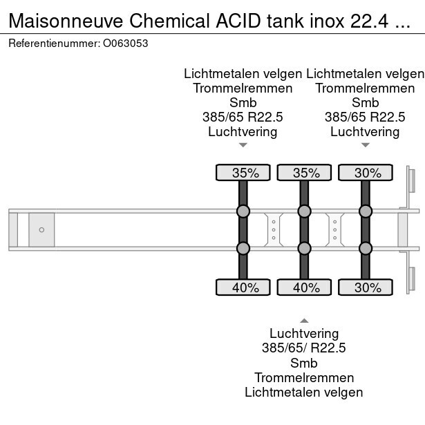 Chemical (acid) tank, Stainless steel (inox),Nominal capacity 22484 litres, 1 Compartment, Originally used for UN 1824 sodium hydroxide, ADR tank code L4BH+, Test pressure 4 bar, Max. working pressure 3 bar, Wall thickness 3 mm (shell), 5 mm (heads), Tank material code Z3CND17.11.02, ABS, Air suspension, SMB axles, Alloy wheels, Shipment dimensions 1100x250x340 cm