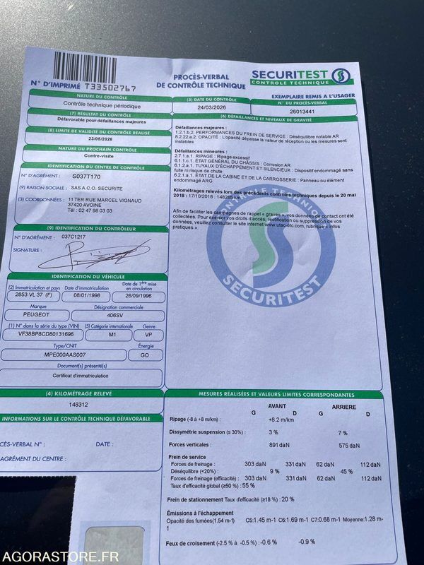 Peugeot 406 Power: 109 Engine volume: 2088 Fuel: diesel Axle 1 common tyre size: 195/65R15 Gearbox type: manual FR: Type de véhicule BERLINE Date et lieu de visite: BEAUMONT EN VERON IMPORTANT: VENDUE EN L'ETAT Nb portes: 4 Etat carrosserie: BON Etat intérieur: BON Etat des pneus: BON Transmission: AVANT Version: ST/SV Etat soubassements: BON ANTI-DEMARRAGE CODE ATTELAGE VITRES ELECTRIQUES STOCKEE AU GARAGE DEPUIS 2018 TRES BON ETAT INTERIEUR / EXTERIEUR ENTRETIEN EN 2018 A 148150KMS MERITE UNE BONNE VERIF AVANT DE REPRENDRE LA ROUTE CT FOURNI EN PHOTO PASSE CE JOUR Ref No:416049 VIN: VF38BP8CD80131696