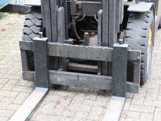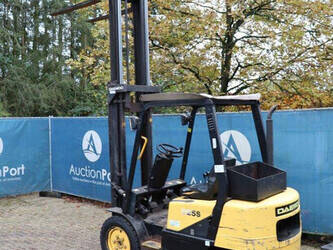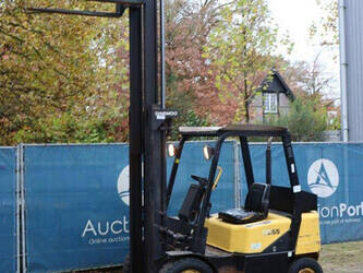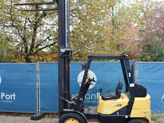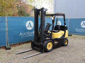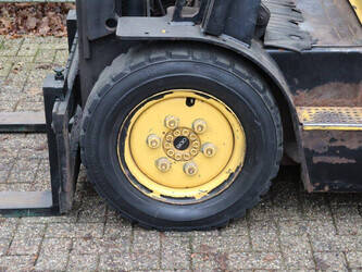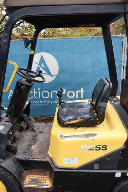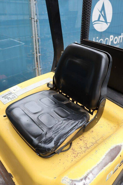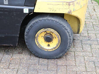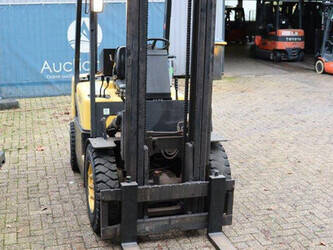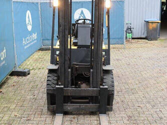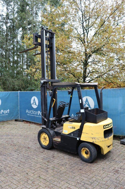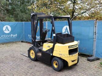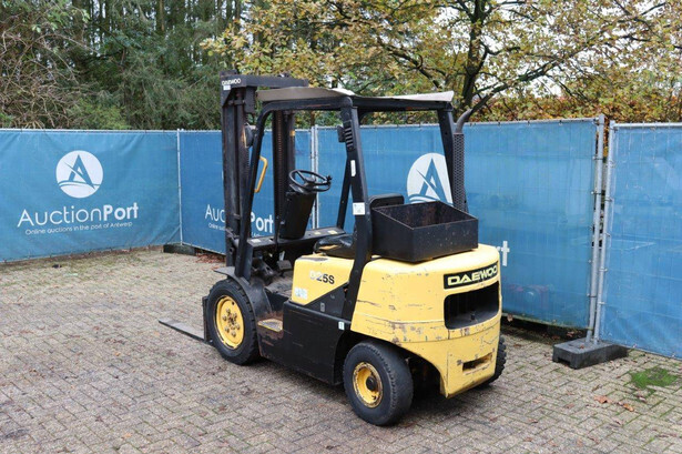 Brand: Daewoo Type: D25-3 Serial number: 9000206 Year of construction: 1998 Fuel: Diesel Mast type: Duplex Sideshift: No Lifting capacity: 2500 kg Lifting height: 3500 mm Operating hours read: 3243 h Machine weight: 3715 kg Tires: Solid tires Color: yellow
