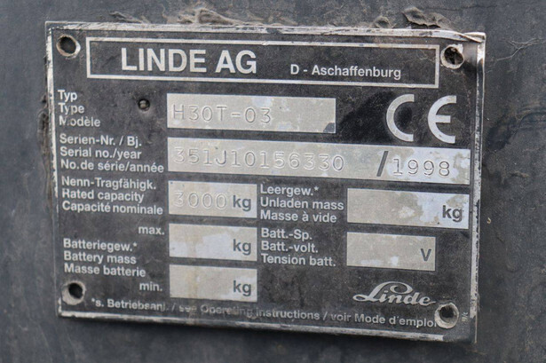 Brand: Linde Type: H30T-03 Serial number: 351J10156330 Year of construction: 1998 Fuel: LPG Mast type: Triplex Sideshift: Yes Lifting capacity: 3000 kg Lifting height: Not known Operating hours read: 5308 h Machine weight: Not known Tires: Solid tires Color: orange