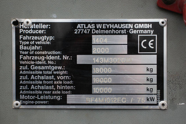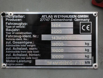 Brand: Atlas Type: 1404 Serial number: 143M302010 Year of construction: 2000 Fuel: Diesel Engine power: 75.0 kW Quick change: Yes Operating hours read: 13290 h Own weight of machine: 18000 kg Chassis: Wheels Color: yellow