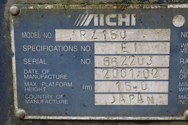 Brand: Aichi Type: RZ150 Serial number: 662203 Year of construction: 2001 Fuel: Diesel Lifting capacity: 250 kg Working height: 17 m Operating hours read: 4415 h Machine weight: 14500 kg Running gear: Tracks Type: Telescopic boom lift Tires: Not known Color: blue