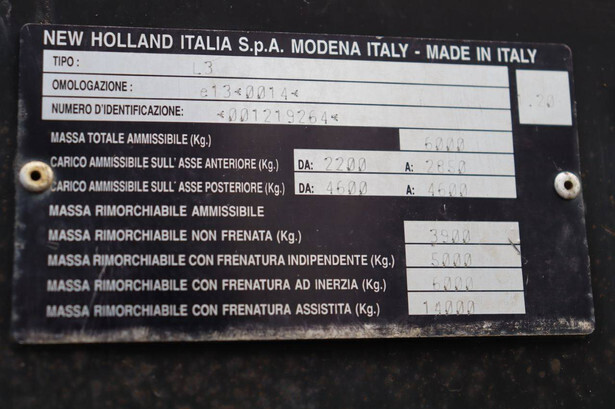 Brand: New Holland Type: TL90 Serial number: 001219264 Year of construction: 2001 Fuel: Diesel Engine power: 67 kW Engine Brand: New Holland Operating hours read: 4837 h Machine weight: 6000 kg Tires: Pneumatic tires Color: blue