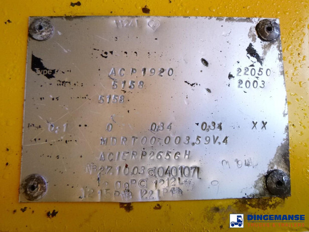 Steel fuel tank, Capacity 5158 (netto) / 5000 (nominal), 1 Compartment, Year of construction 2003, Tank material code P265 GH, Test pressure 0.34 bar, Max working pressure 0 bar, Hydraulic discharge pump, Analogue counter, Hose reel // Truck 4x2, Euro 3, Dci engine, Manual gearbox with 5 gears, Full steel suspension, Diff lock, 225/75 R17.5 tires, Analogue tachograph, Shipment dimensions 530x230x250 cm