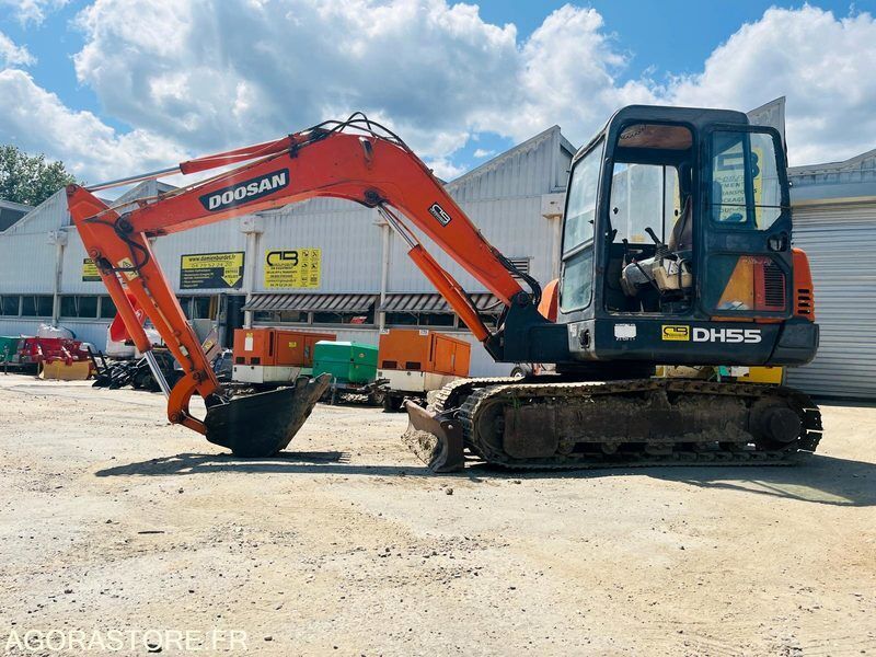 Doosan DH55-V Weight: 5600 Color: orange Power: 58 Fuel: diesel Overall height: 1.98 Overall length: 5.9 Overall width: 1.88 FR: Type de véhicule MINIPELLE Date et lieu de visite: SUR RDV (73) Dimensions (Longueur, Largeur, Hauteur): Long 5.9m x Larg 1.88m x Haut 1.98m IMPORTANT: VENTE EN L'ÉTAT Mini pelle DOOSAN 5T Modèle DH55 Nb heure inconnue (compteur à cristaux liquides illisible) Poids 5.6T Ligne auxiliaire Chenilles FER Puissance moteur 57 cv 1 Godet de Terrassement Dimensions Long 5.9m x Larg 1.88m x Haut 1.98m Machine fonctionnelle Ref No:KQ48420 VIN: 23983