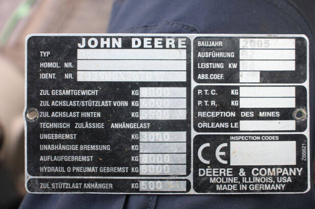 Brand: John Deere Type: 3800 Serial number: Z03800X207017 Year of construction: 2005 Fuel: Diesel Engine power: 86 kW Engine Brand: John Deere Reading operating hours: 1022 h Machine weight: 8000 kg Tires: Pneumatic tires Color: green