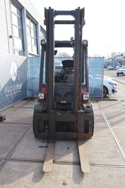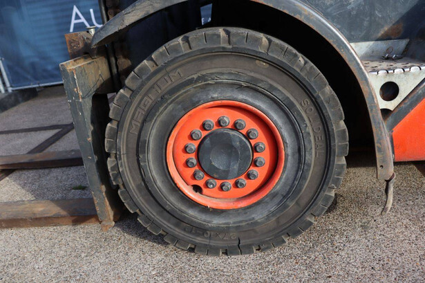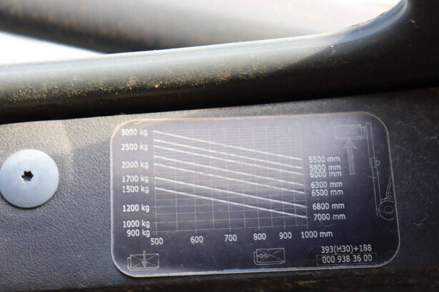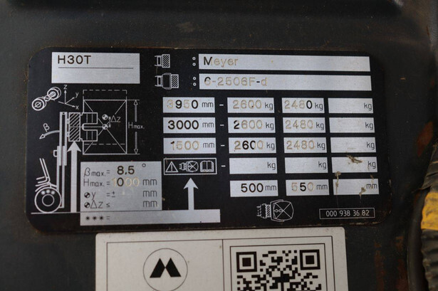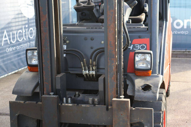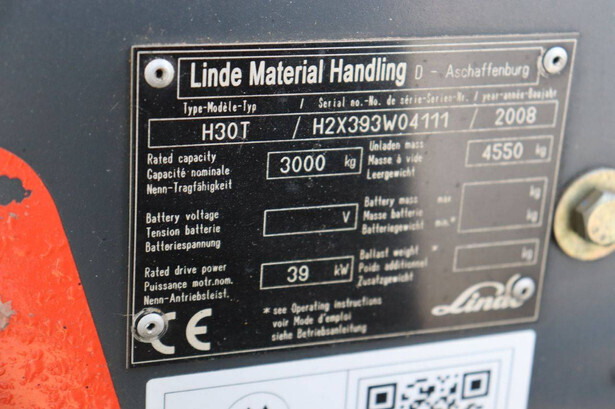 Brand: Linde Type: H30T Serial number: H2X393W04111 Year of construction: 2008 Fuel: LPG Mast type: Duplex Sideshift: No Lifting capacity: 3000 kg Lifting height: 3950 mm Operating hours read: 15269 h Machine weight: 4550 kg Tires: Solid tires Color: red