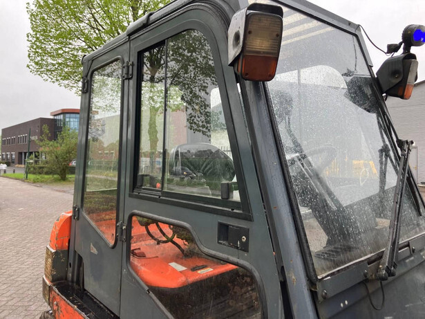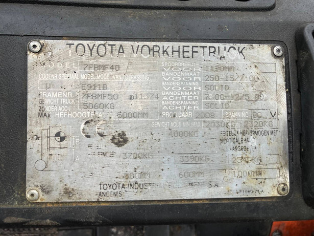 Brand: Toyota Type: 7FBMF40 Serial number: 7FBMF5011374 Year of construction: 2008 Fuel: Electric Mast type: Triplex Sideshift: Yes Lifting capacity: 4000 kg Lifting height: 5000 mm Operating hours read: 18132 h Machine weight: 7380 kg Tires: Solid tires Color: red