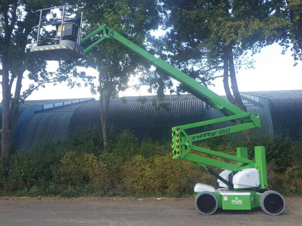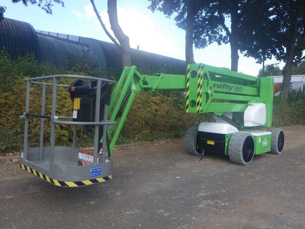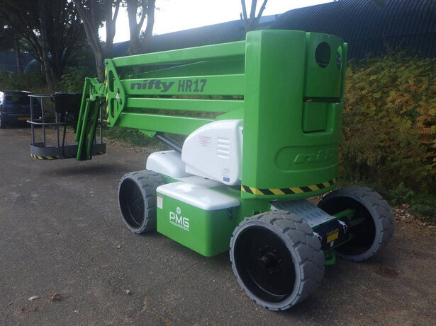 Brand: Nifty Model: HR17NE Type: Articulated boom lift Serial number: 05-24511 Year of construction: 2012 Operating hours read: 1484h Fuel: Electric battery Working height: 17m Lateral reach: 9.7m Lifting capacity: 225kg Machine weight: 7780kg Wheels: non-marking tires