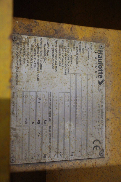Brand: Haulotte Type: Compact 10 Serial number: CE150662 Year of construction: 2013 Fuel: Electric Lifting capacity: 450 kg Working height: 10 m Operating hours read: 656 h Machine weight: 2235 kg Chassis: Wheels Type: Scissor lift Tires: Non-marking tires Color: yellow