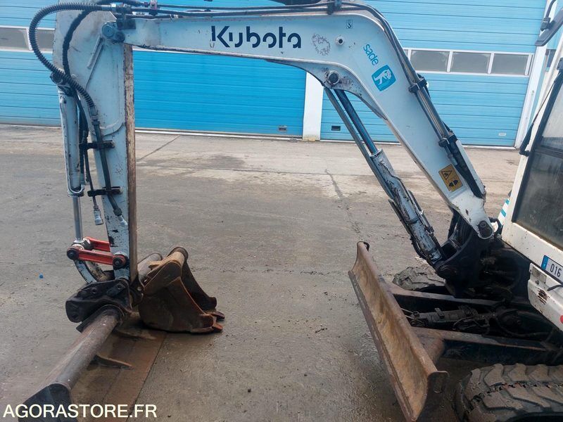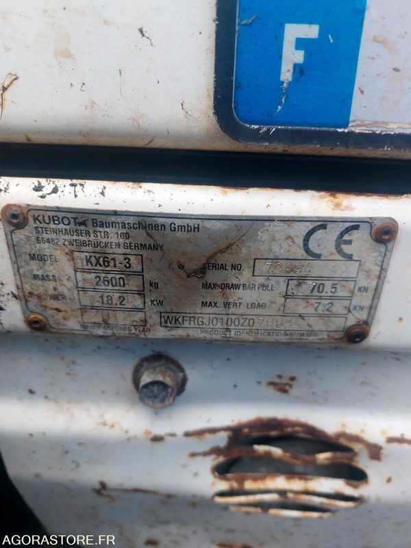 Kubota KX61.3 FR: Type de véhicule MINI PELLE IMPORTANT: EN L'ETAT, MOTEUR OK Nombre de godets: 2 CE: WKFRGJ0100Z079894 carburant: GNR MINI PELLE KUBOTA KX61.3 5745H PRESENCE JEUX FLECHE/BALANCIER CHENILLES USEES Ref No:410444 VIN: WKFRGJ0100Z079894