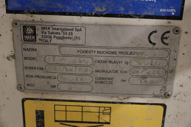 Brand: Iteco Type: IT10090 Serial number: 80127142 Year of construction: 2014 Fuel: Electric Working height: 12 m Operating hours read: 678 h Machine weight: 3080 kg Chassis: Wheels Type: Scissor lift Tires: Non-marking tires Color: white
