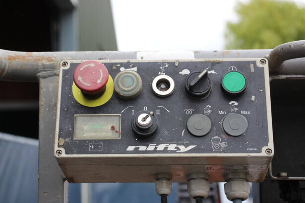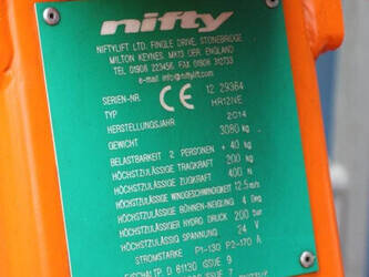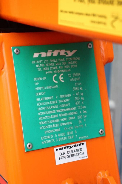 Brand: Niftylift Type: HR12NE Serial number: 12 29364 Year of construction: 2014 Fuel: Electric Lifting capacity: 200 kg Working height: 12.1 m Chassis: Wheels Type: Articulated boom lift Tires: Pneumatic tires Color: orange
