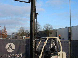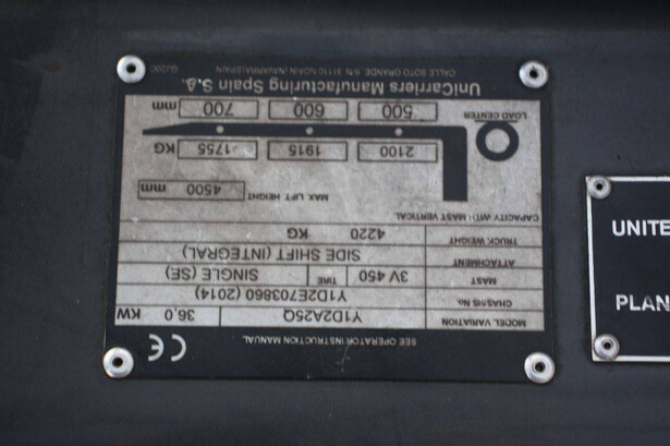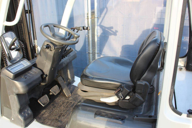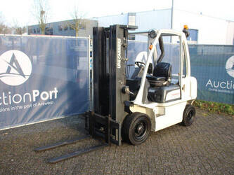 Brand: Nissan Type: Y1D2A25Q Serial number: Y1D2E703860 Year of construction: 2014 Fuel: Diesel Mast type: Triplex Sideshift: Yes Lifting capacity: 2100 kg Lifting height: 4500 mm Operating hours read: 3463 h Machine weight: 4220 kg Tires: Solid tires Color: white