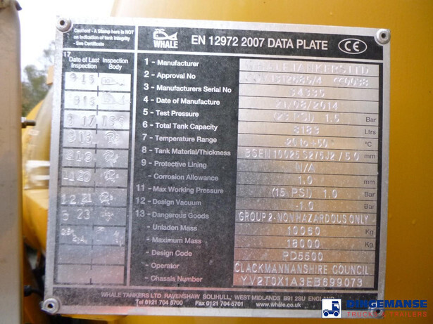 NON DUTY FREE, REQUIRES CUSTOM CLEARANCE // Whale steel vacuum tank, Capacity 8183 liters, Year of construction 2014, Tank material code BS EN 10025 S275J2, Test pressure 1.5 bar, Max working pressure 1.0 bar and - 1.0 bar vacuum, Pratissoli / KT 36 pump, 125 liter per minute, max pressure 125 bar // Truck 4x2, Euro 6, Manual gearbox with 6 gears, Steel front suspension, Air rear suspension, Diff lock, Day cabin, Digital tachograph, Shipment dimensions 810x250x365 cm
