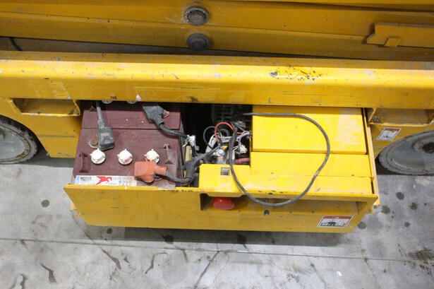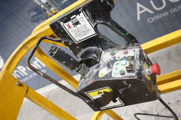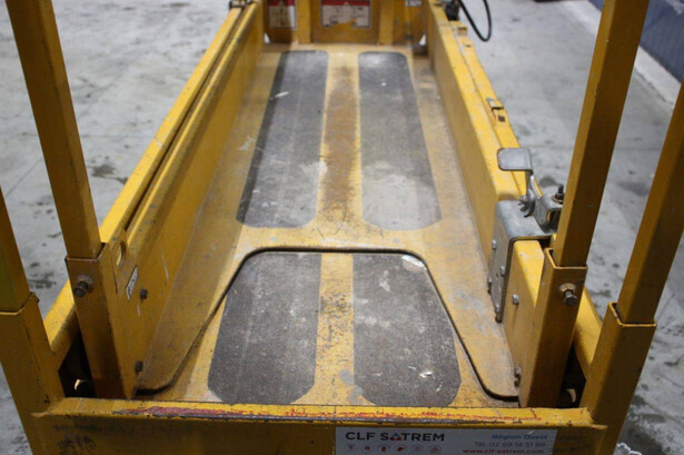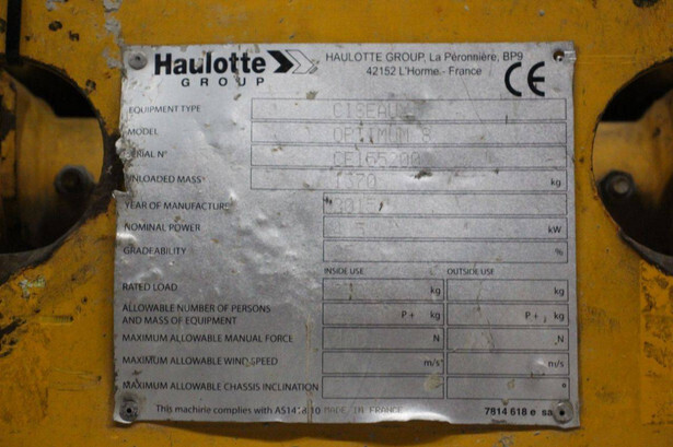 Brand: Haulotte Type: Optimum 8 Serial number: CF155200 Year of construction: 2015 Fuel: Electric Lifting capacity: 230 kg Working height: 7.7 m Operating hours read: 788 h Machine weight: 1370 kg Chassis: Wheels Type: Scissor lift Tires: Non-marking tires Color: yellow