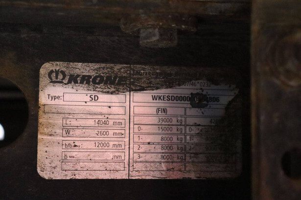 Brand: Krone Type: SD Chassis number: WKESD0000000664806 Year of construction: 2015 MTM: 39000 kg Number of axles: 3 Brakes: Disc brakes
