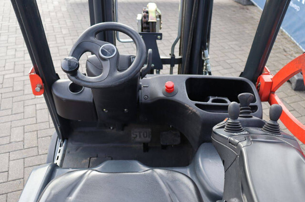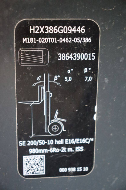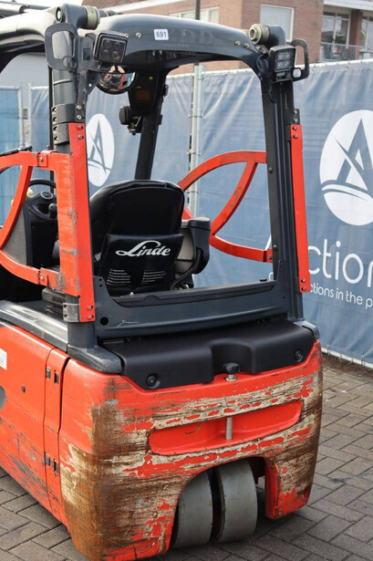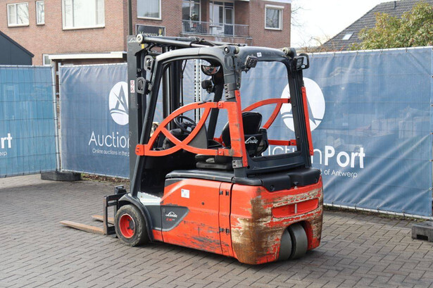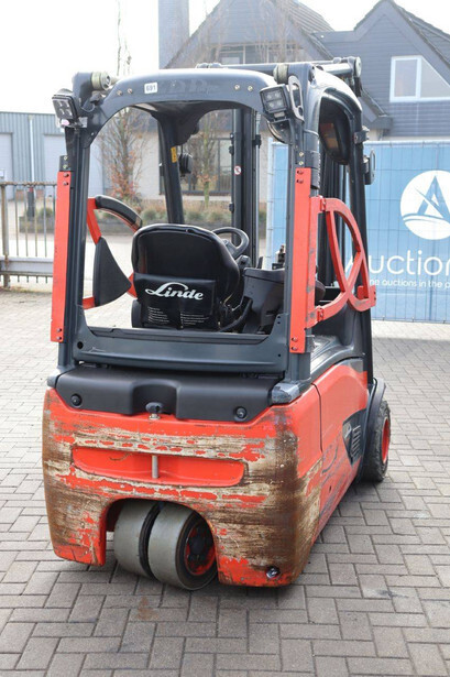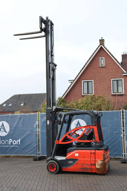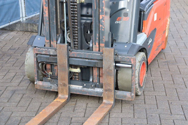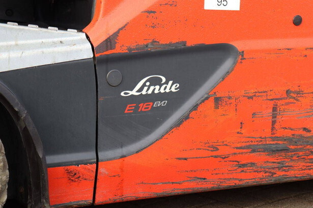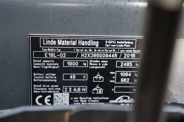 Brand: Linde Type: E18L-02 Serial number: H2X386G09446 Year of construction: 2016 Fuel: Electric Mast type: Duplex Sideshift: Yes Lifting capacity: 1800 kg Lifting height: 6000 mm Operating hours read: 12292 h Machine weight: 3550 kg Tires: Non-marking tires Color: orange