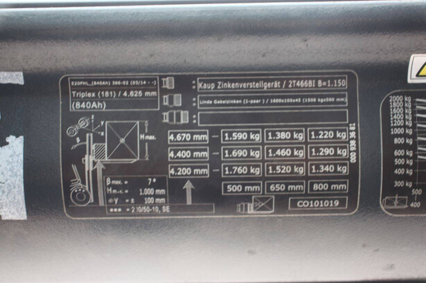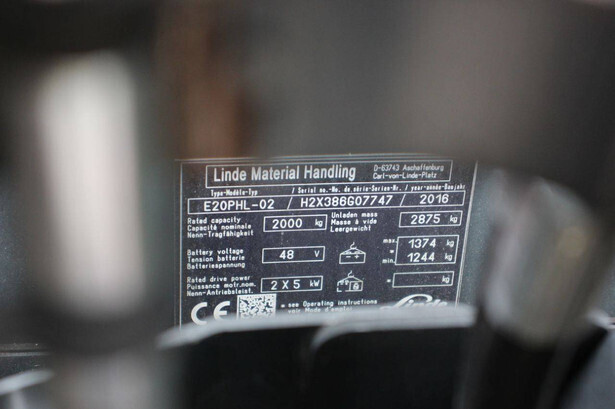 Brand: Linde Type: E20PHL-02 Serial number: H2X386G07747 Year of construction: 2016 Fuel: Electric Mast type: Triplex Sideshift: Yes Lifting capacity: 2000 kg Lifting height: 4625 mm Operating hours read: 15317 h Machine weight: 4249 kg Tires: Non-marking tires Color: orange