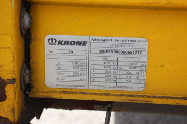 Brand: Veldhuizen Type: Krone SD Chassis number: WKESD000000661272 Year of construction: 2016 MTM: 41000 kg Number of axles: 3 Brakes: Not known Dimensions: L: 13860 mm, W: 2550 mm, w/b max: 12000 mm Mileage reading: Not known
