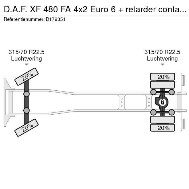 Truck 4x2, Euro 6, Adblue, Automatic gearbox, Diff lock, Retarder, Air front suspension, Air rear suspension, Lemasson superstructure for 20 ft. containers, Pommier hitch, Lowerable bumper, Sleep cabin, 2 beds, Airconditioning, Night heater, Digital tachograph, Truck lenght 1025 cm // Krone trailer for 20 ft. containers, Hitch height 35 cm, Air suspension, Disc brakes, BPW axles, ABS, Trailer lenght + connection bar 950 cm // Total shipment dimensions 1840x250x360 cm