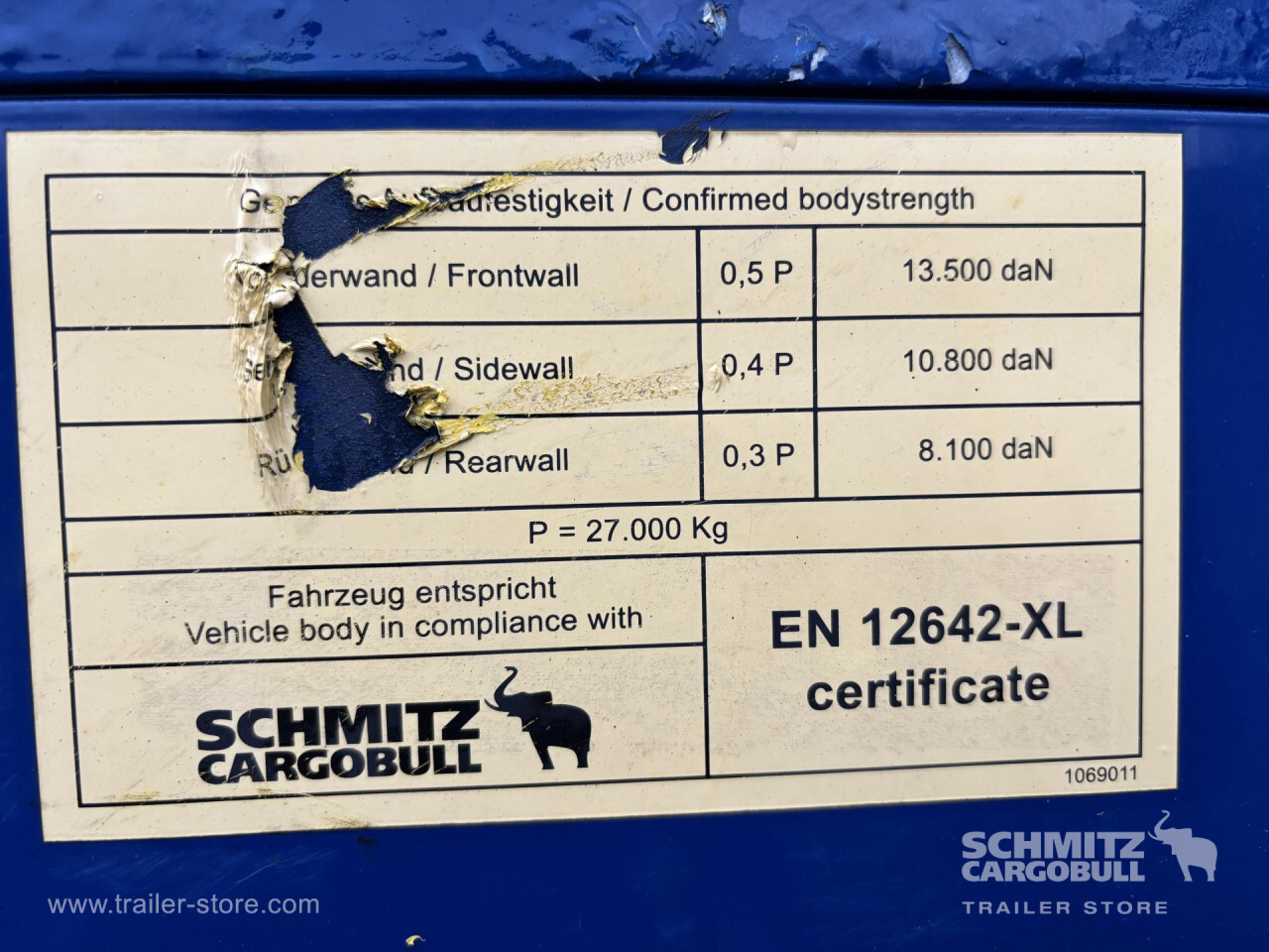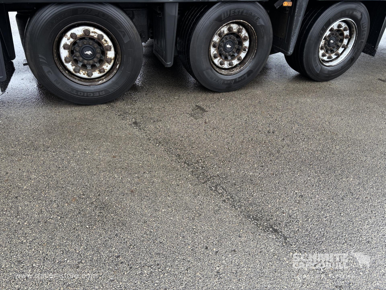 Remarks: **Safety**\\Rear underrun, Antilock Braking System ABS\\\\**Interior**\\Additional stake pockets\\\\**Exterior**\\Air suspension, Ferry lashings, Bolted chassis, Sliding roof, 1x15 and 2x7 pin plug, Antispray, Lifting roof (manual)\\\\**Cargo securing**\\DIN EN 12642 (code XL) certificate, Wooden - support slats\\\\**Brake system**\\Disc brake, Schmitz ROTOS\\\\**Loading area**\\Length 13.620 mm, Width 2.480 mm, Height 2.900 mm, Volume 97 m³\\\\**Tyre sizes**\\1. Achse: 435/50 R19.5 , Tread depth: 8 mm / 8 mm, 2. Achse: 435/50 R19.5 , Tread depth: 10 mm / 11 mm, 3. Achse: 435/50 R19.5 , Tread depth: 6 mm / 4 mm\\\\**Other dimensions and weights**\\Payload: 32.096 kg, GVW: 39.000 kg, Wheel base: 7.700 mm\\\\----