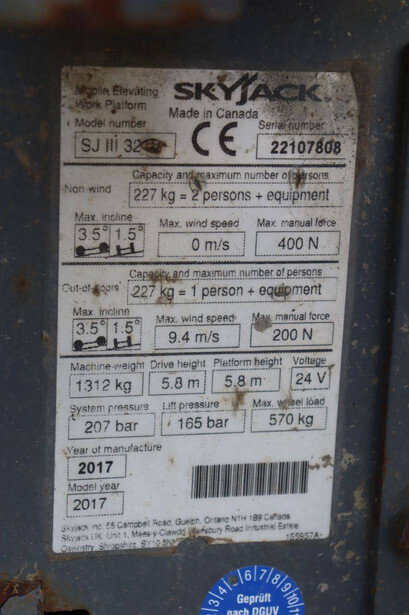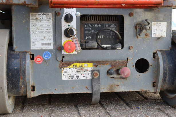 Brand: Skyjack Type: SJIII 3219 Serial number: 221017608 Year of construction: 2017 Fuel: Electric Lifting capacity: 227 kg Working height: 7.79 m Operating hours read: 374 h Machine weight: 1312 kg Chassis: Wheels Type: Scissor lift Tires: Non-marking tires Color: red