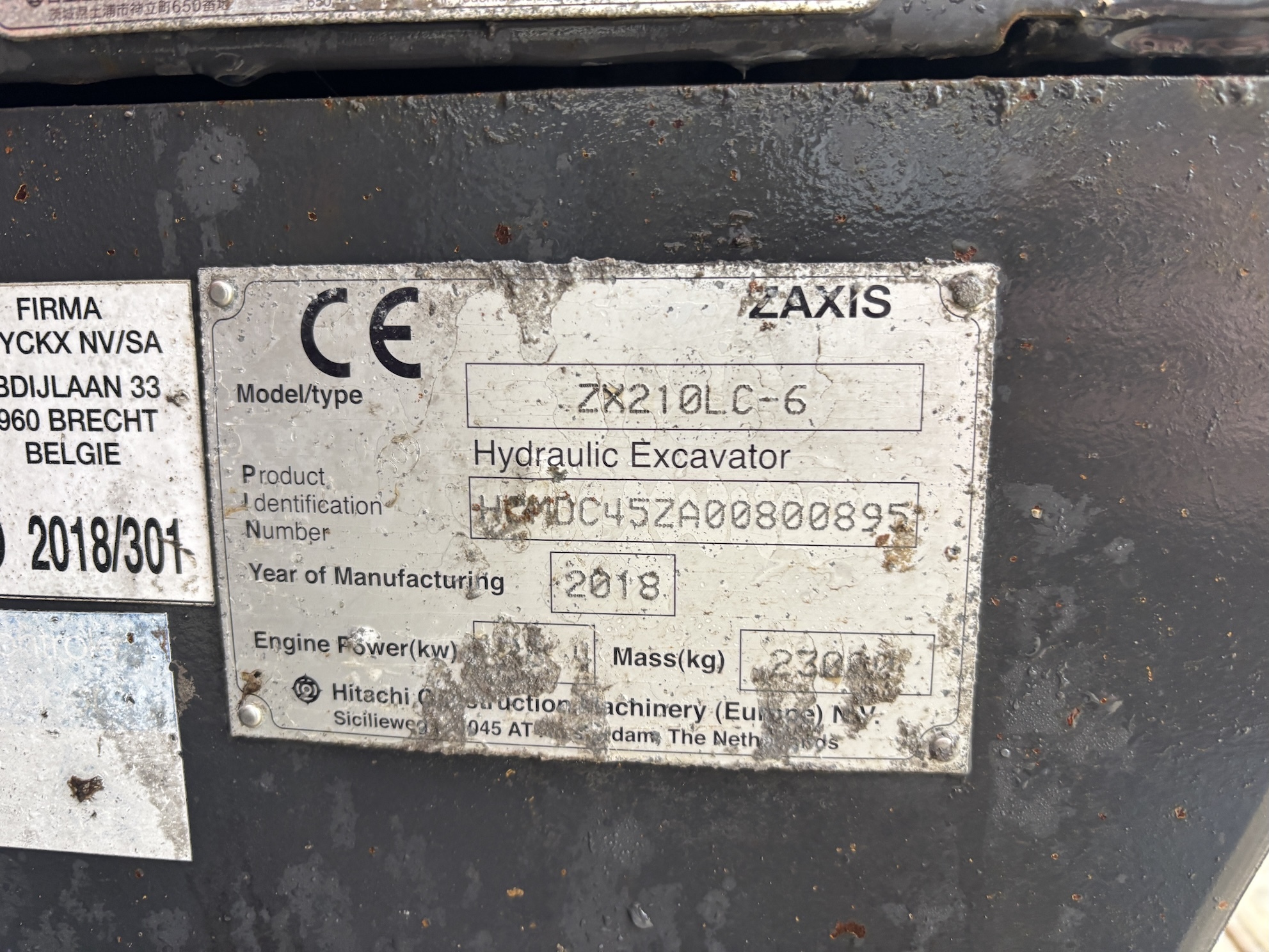 Hitachi ZX210LC-6 Weight 23000 This Hitachi ZX210LC-6 track excavator is equipped with a 4 cilinder water cooled turbo charged Isuzu 4HK1 (124kW) diesel engine with 10775 working hours on the service meter. More over, machine has hydraulics for hammer function and rotation function, hydraulic quick hitch, teeth bucket, extra work lights, airco, radio etc.Well functioning Hitachi ZX210LC-6 with undercarriage being around 30%, some corrosion on some components. For more information please contact us.