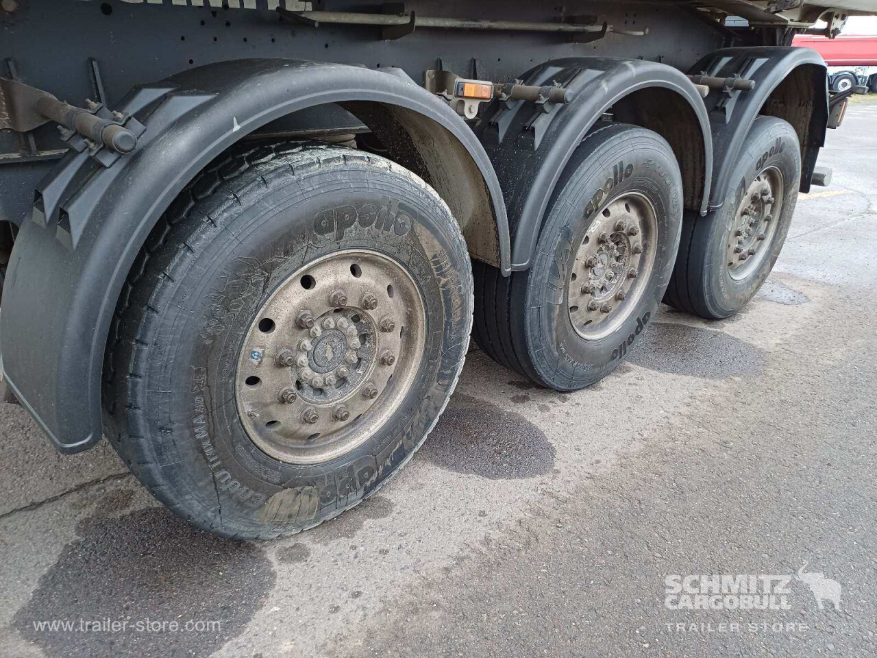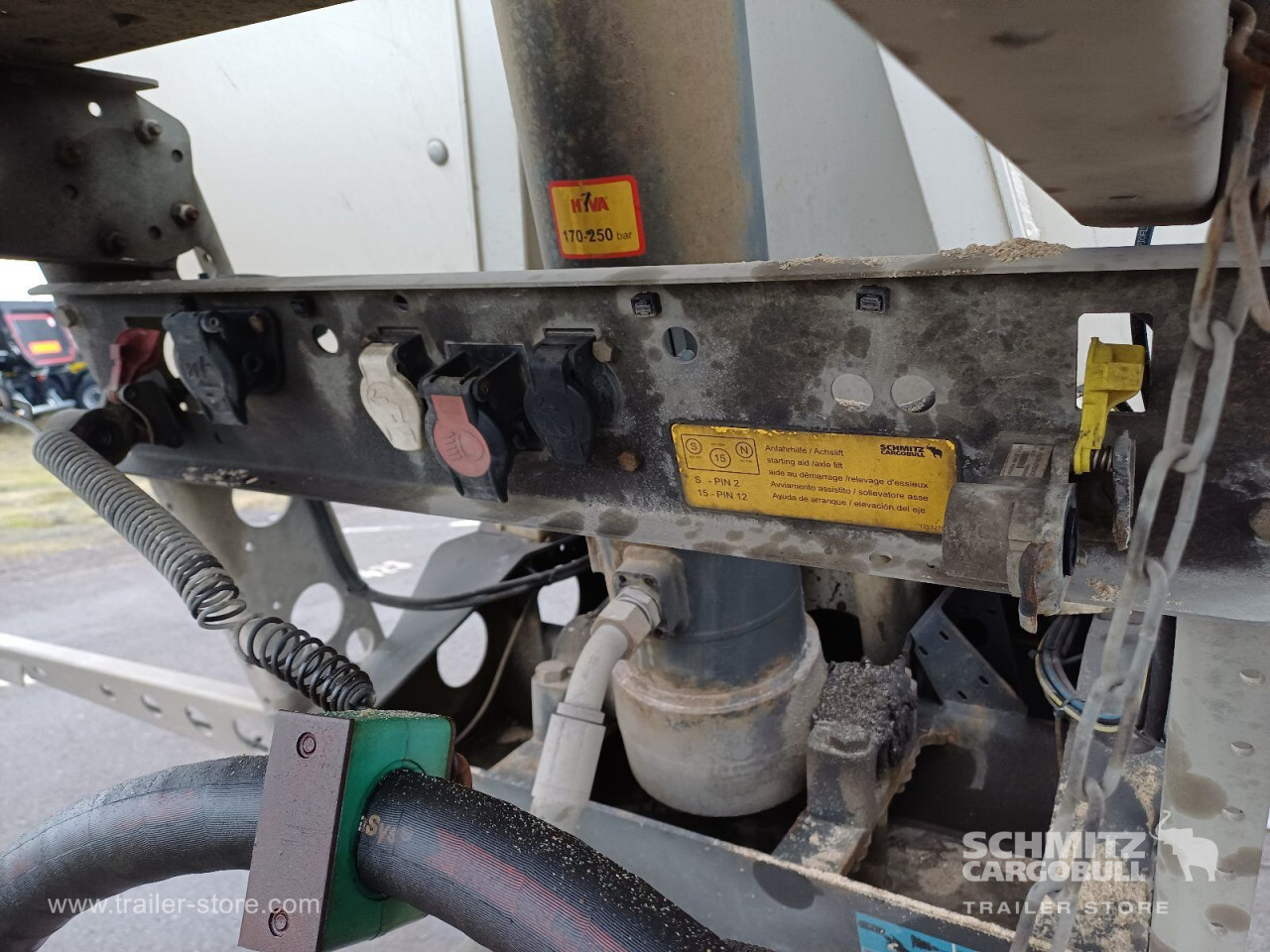 Remarks: **Safety**\\Hinged rear underrun, Antilock Braking System ABS\\\\**Exterior**\\Air suspension, Lift axle front, Exterior pendulum tailgate, Roof rolling tarpaulin, Access platform, 1x15 and 2x7 pin plug, Antispray, Light alloy rims\\\\**Brake system**\\Disc brake, Schmitz ROTOS\\\\**Loading area**\\Length 7.500 mm, Width 2.440 mm, Height 1.350 mm, Volume 24 m³\\\\**Tyre sizes**\\1. Achse: 385/65 R22.5 , Tread depth: 10 mm / 14 mm, 2. Achse: 385/65 R22.5 , Tread depth: 13 mm / 12 mm, 3. Achse: 385/65 R22.5 , Tread depth: 9 mm / 8 mm\\\\**Other dimensions and weights**\\GVW: 36.000 kg\\\\----