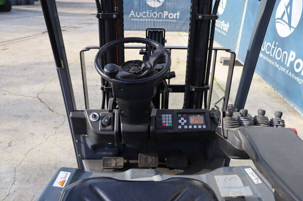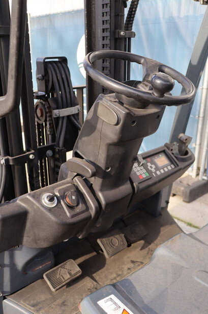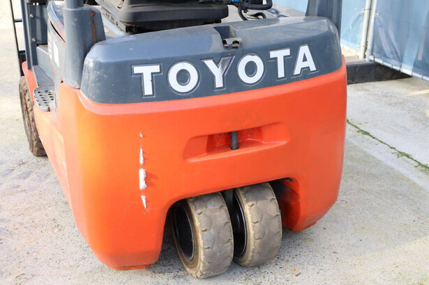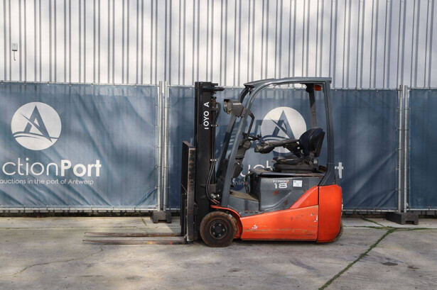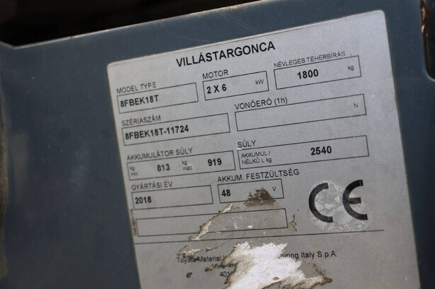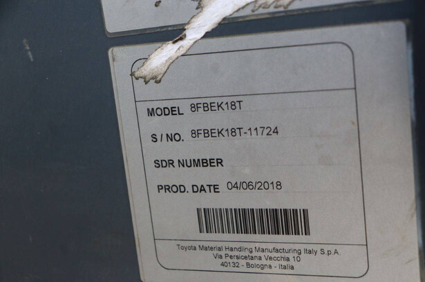 Brand: Toyota Type: 8FBEK18T Serial number: 8FBEK18T-11724 Year of construction: 2018 Fuel: Electric Mast type: Duplex Sideshift: Yes Lifting capacity: 1800 kg Lifting height: 3000 mm Operating hours read: 10004 h Machine weight: 3459 kg Tires: Solid tires Color: orange
