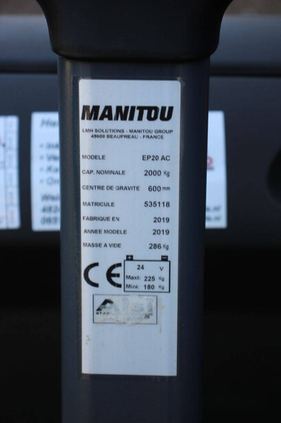 Brand: Manitou Type: EP20 AC Serial number: 535118 Year of construction: 2019 Fuel: Electric Lifting capacity: 2000 kg Reading operating hours: 15 h Machine weight: 511 kg Color: red