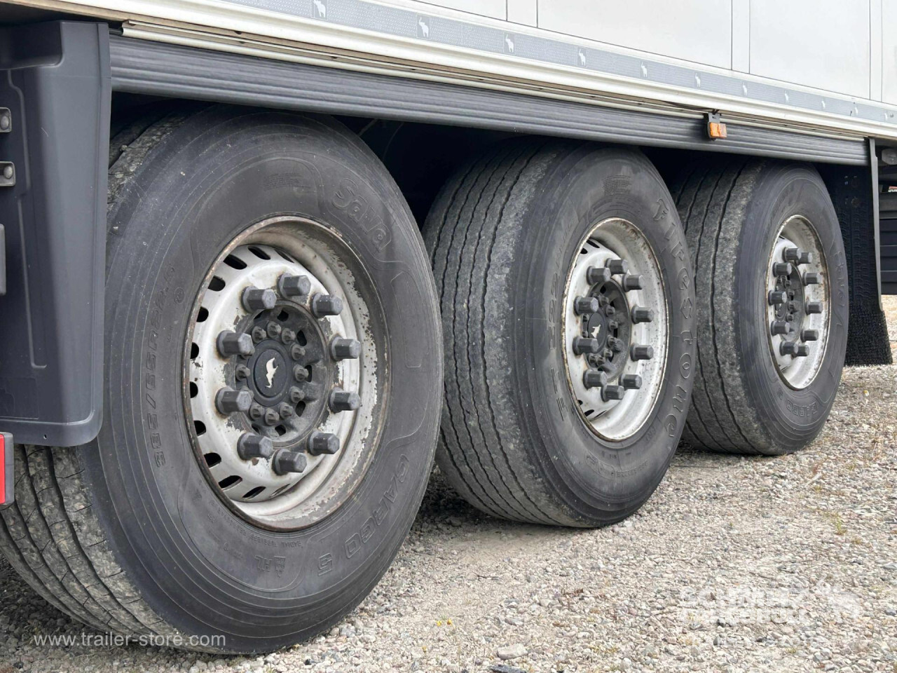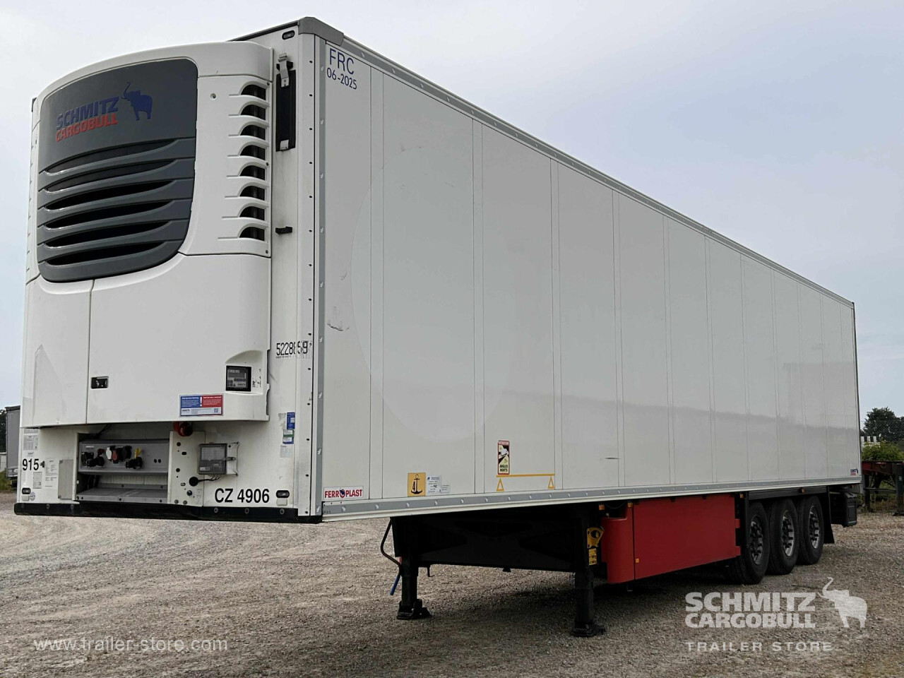 Remarks: **Safety**\\Fixed rear underrun, Antilock Braking System ABS\\\\**Interior**\\ISO partition wall without ventilators, Double deck with beams\\\\**Exterior**\\Air suspension, Pallet box (double), Ferry lashings, 1x15 and 2x7 pin plug, Antispray, Customs sealing capability\\\\**Brake system**\\Disc brake, Schmitz ROTOS\\\\**Floor**\\Aluminum floor\\\\**Cooling unit**\\Schmitz Cargobull, Diesel/Elektro, 17.176 Operating hours Diesel, 597 Operating hours electric\\\\**Loading area**\\Length 13.403 mm, Width 2.490 mm, Height 2.700 mm, Volume 90 m³\\\\**Tyre sizes**\\ 385/65 R22.5 , 385/65 R22.5 , 385/65 R22.5\\\\----