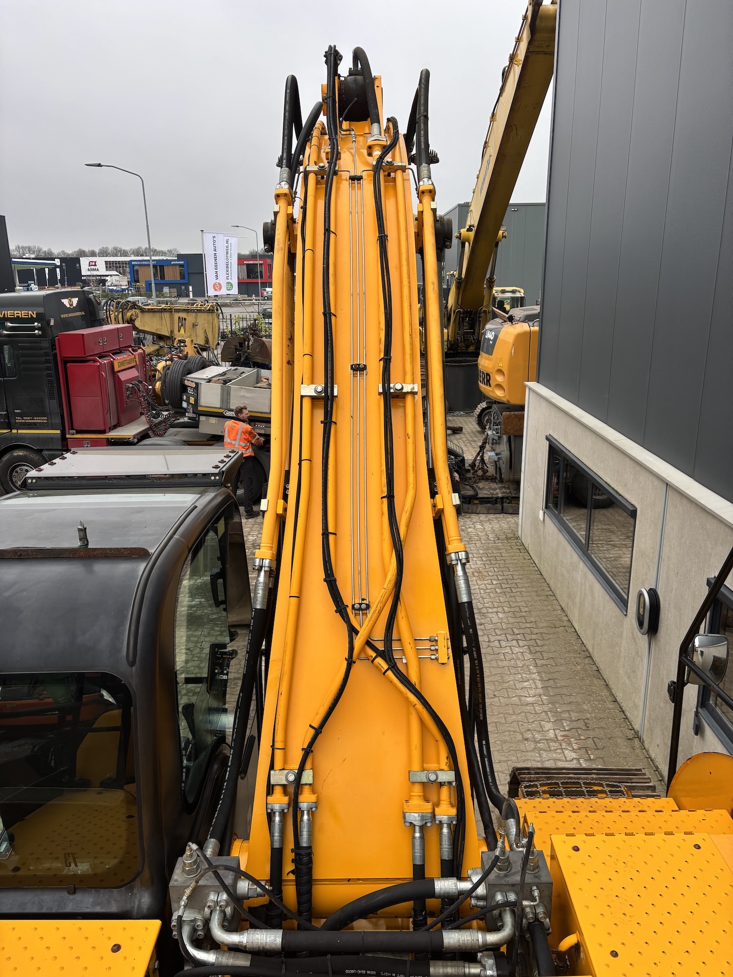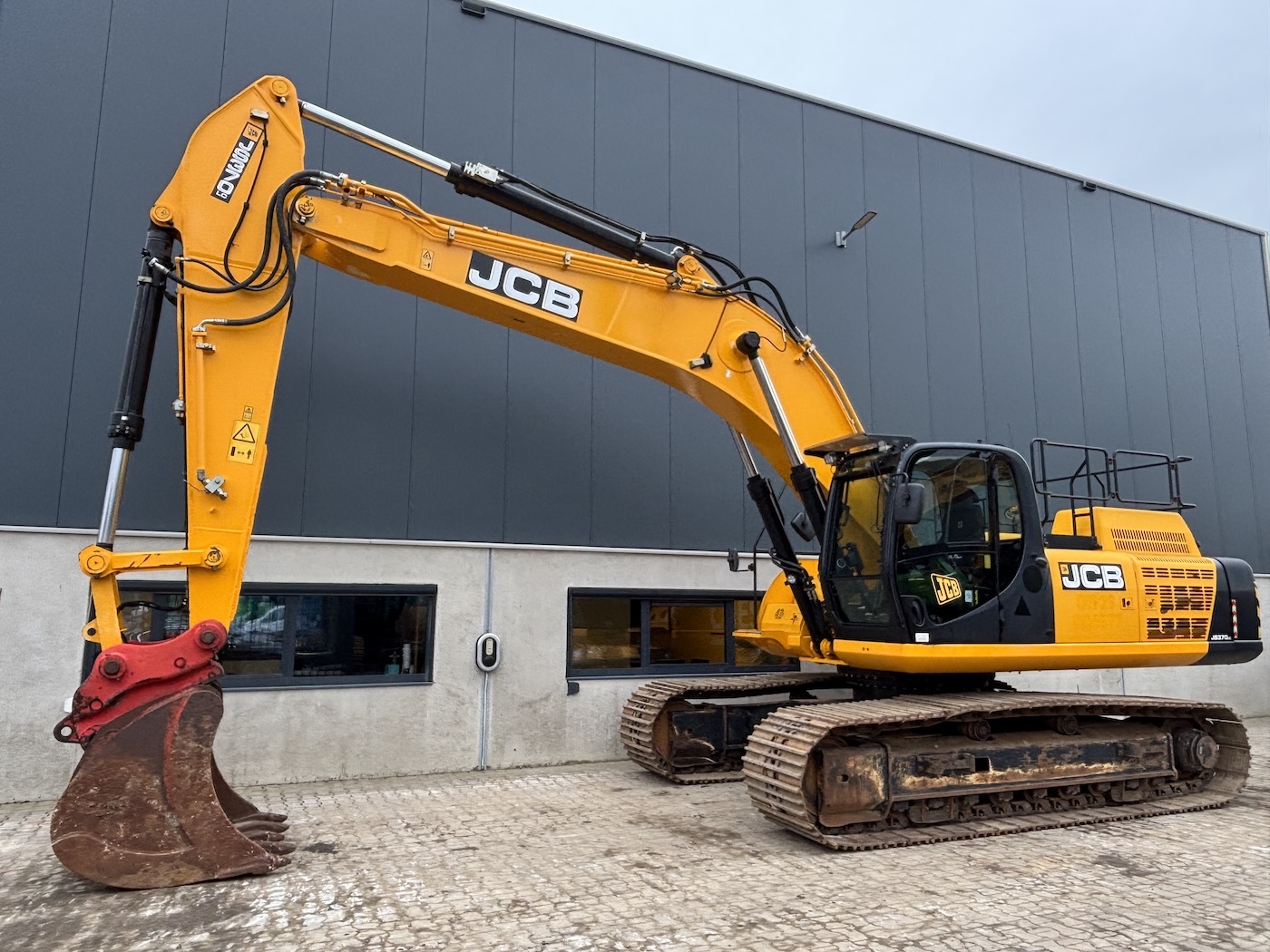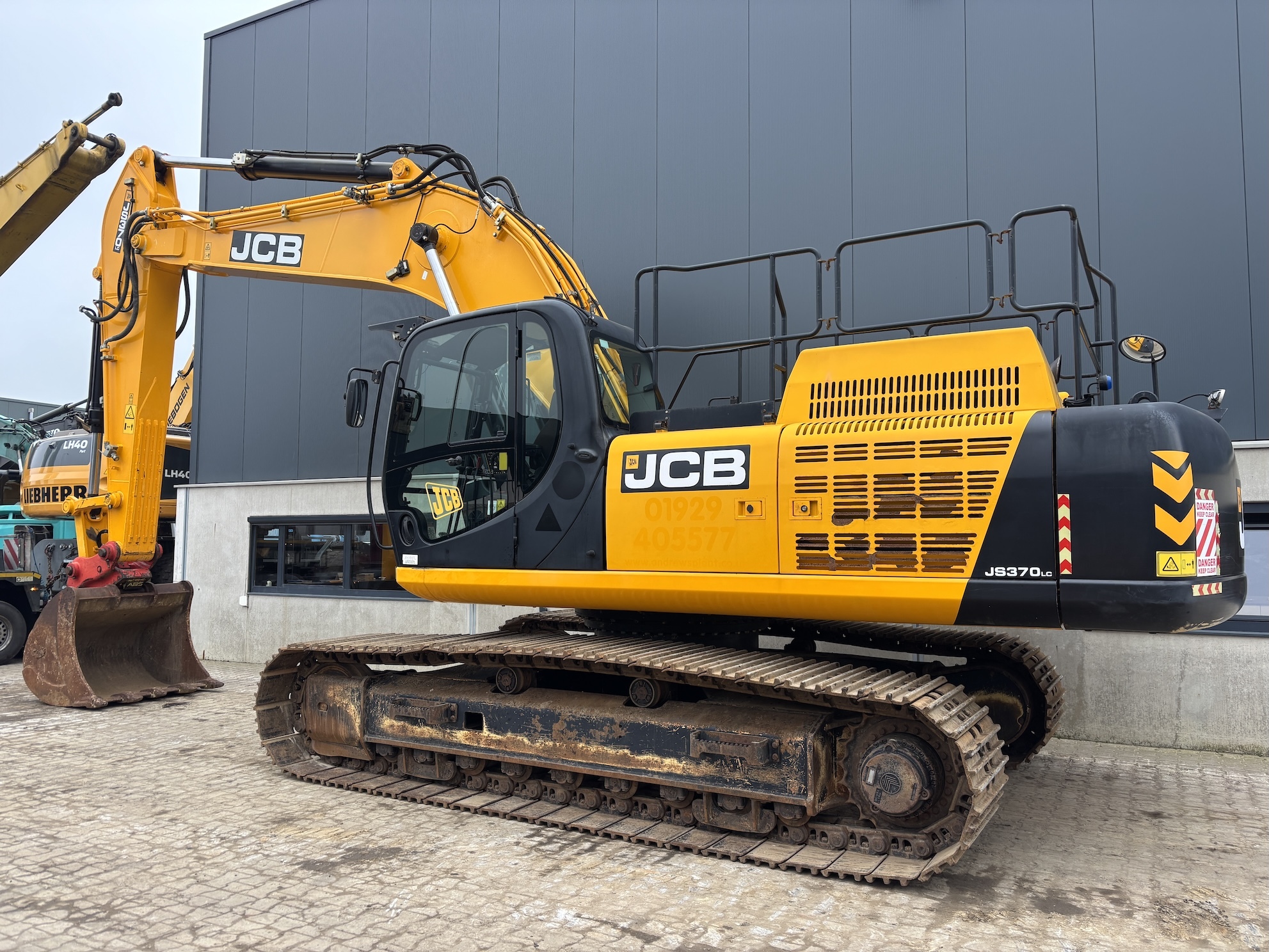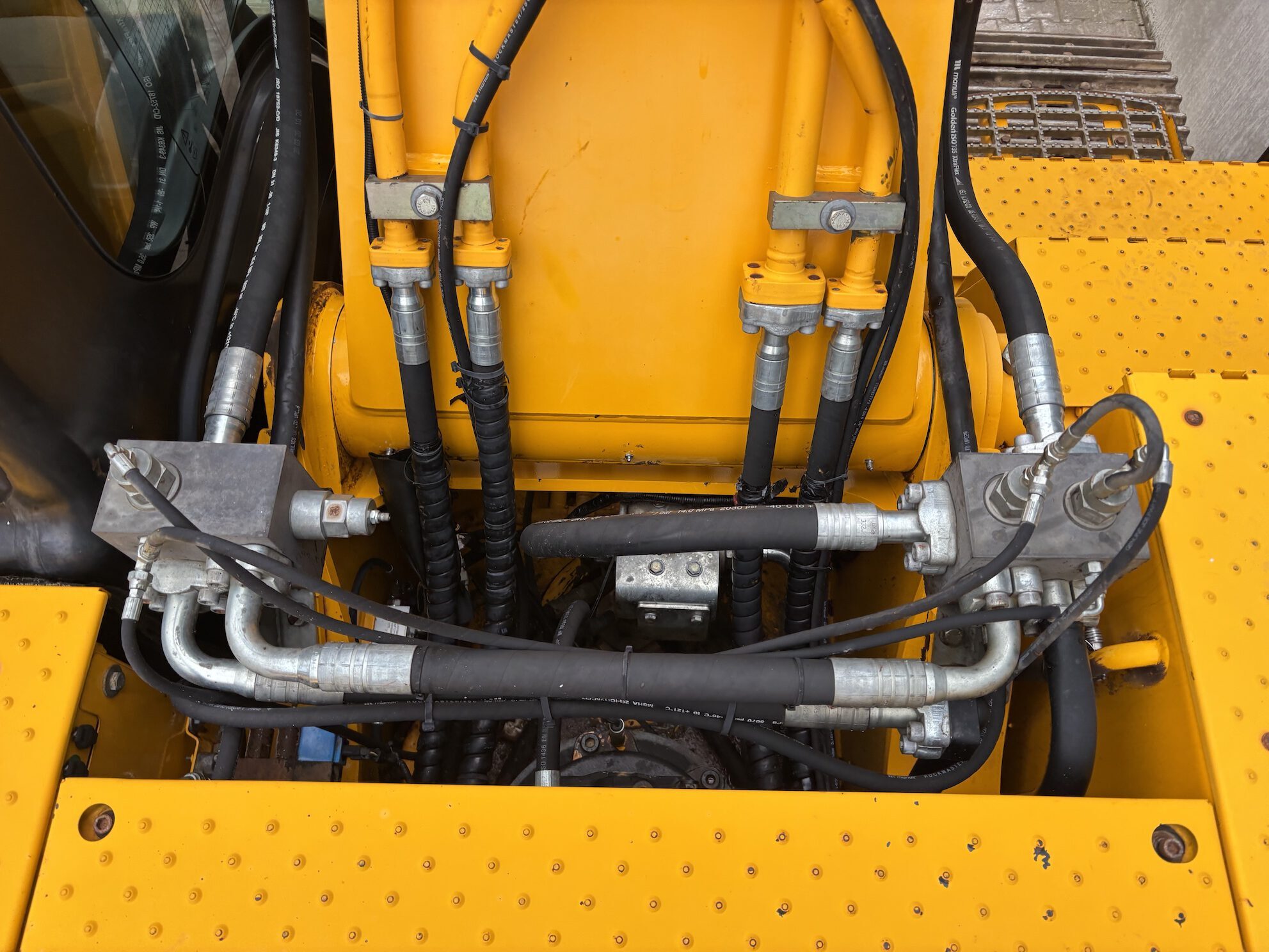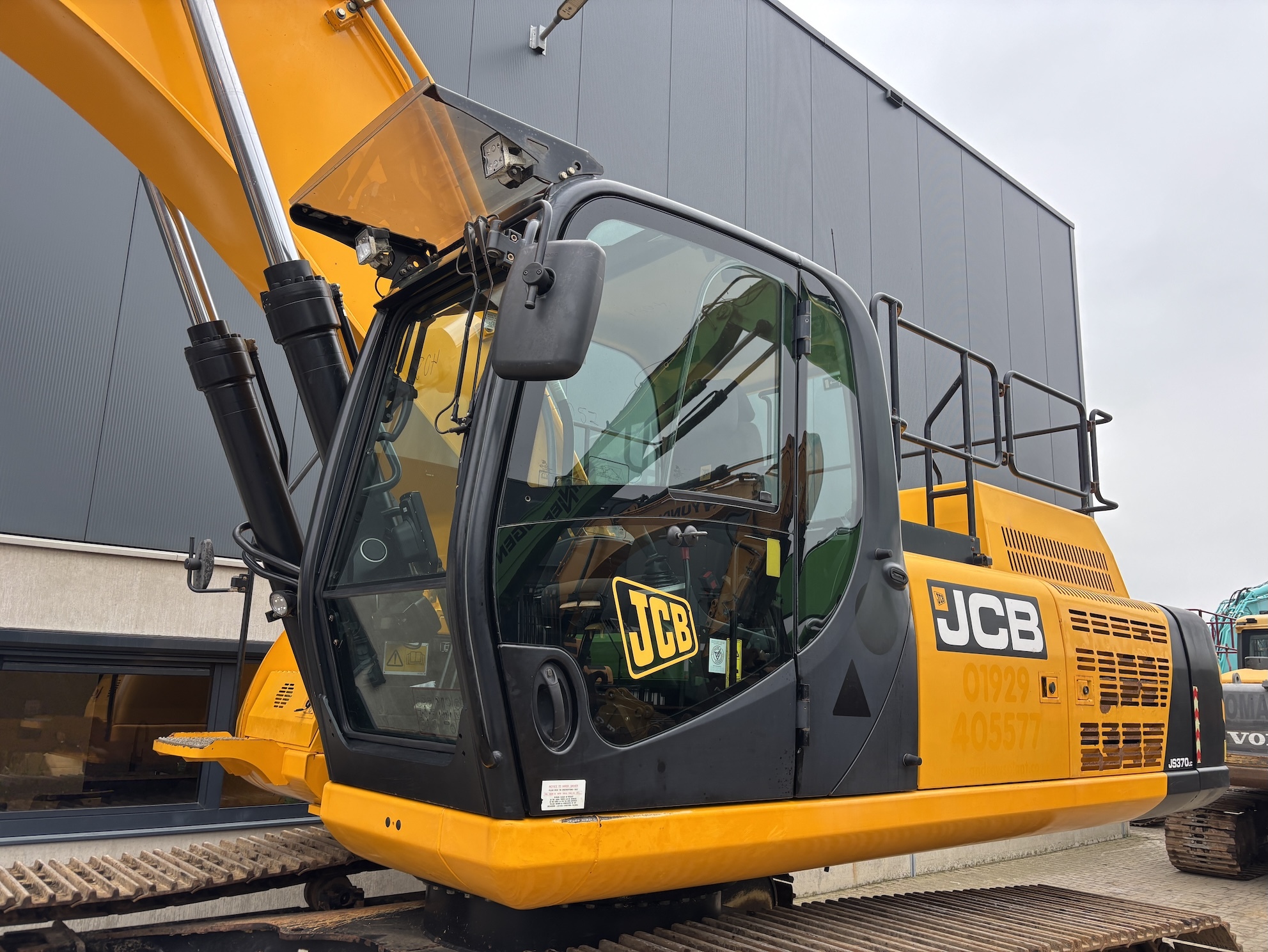 This JCB JS370LC is equipped with a 6 cilinder water cooled turbo charged Mercedes OM936LA diesel engine (210) with just 6377 working hours on the service meter. Hydraulics for rotation and hammer functions, hydraulic quick hitch, teeth bucket, safety guards on top, extra work lights, operator manual, side view camera, airco, radio, electric diesel pump etc.Really nice JCB JS370, original paintwork, almost no scratches. Sprockets are poor but the chains are not too bad. Functions well, no errors. Please contract us for more information.