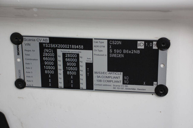 Brand: Scania Type: S590VB 6x2NB Chassis number: YS2S6X20002189458 Year of construction: 2022 Fuel: Diesel Engine power: 590.0 HP Transmission: Automatic Odometer reading: 512868 KM Number of axles: 3 Color: white
