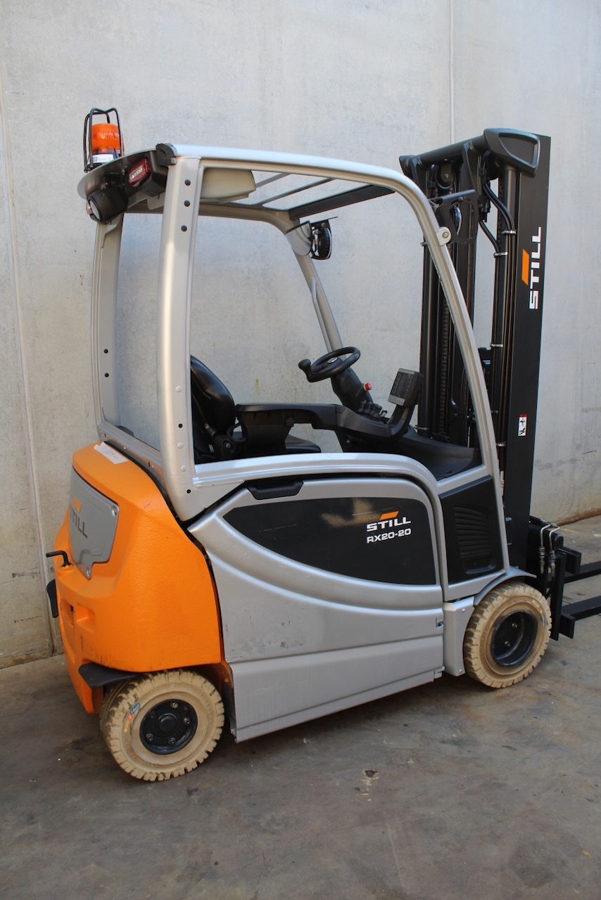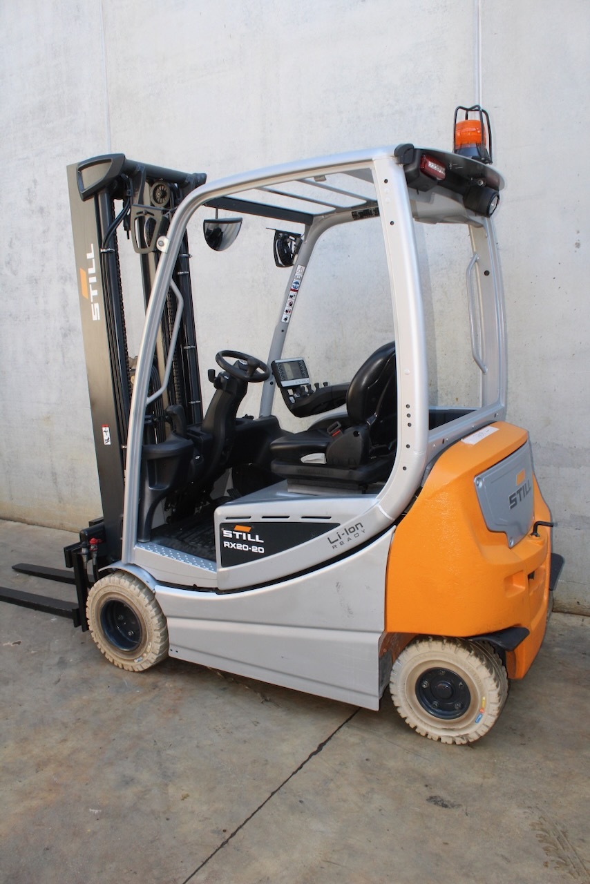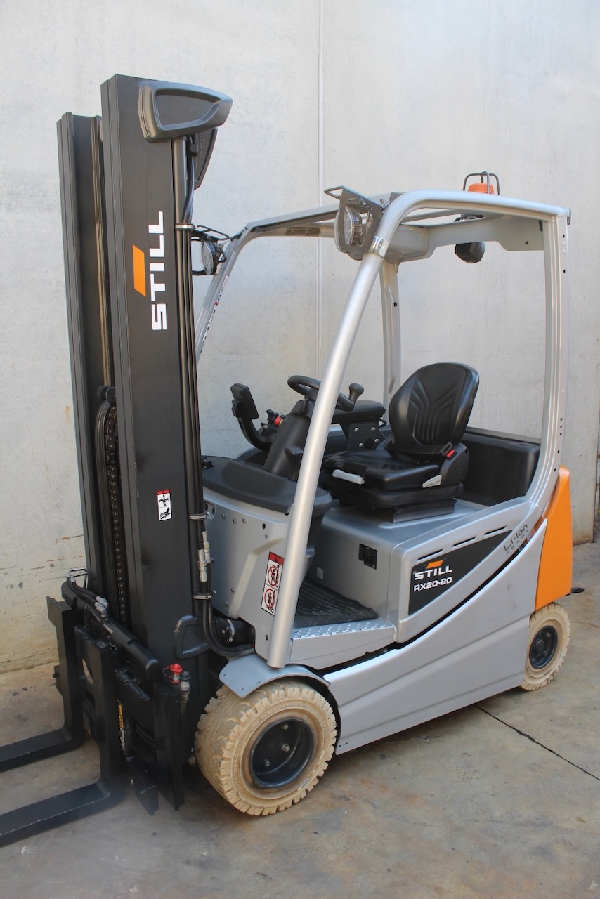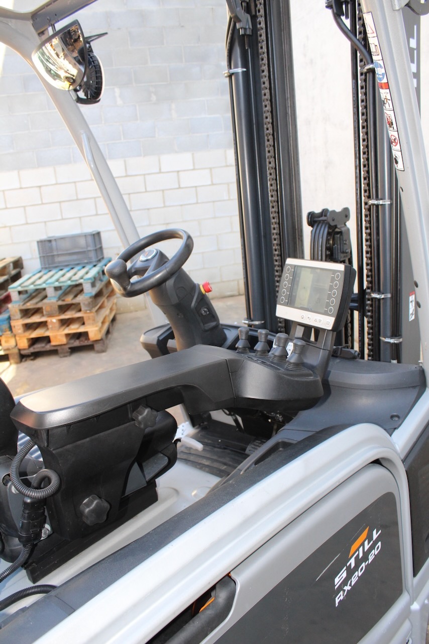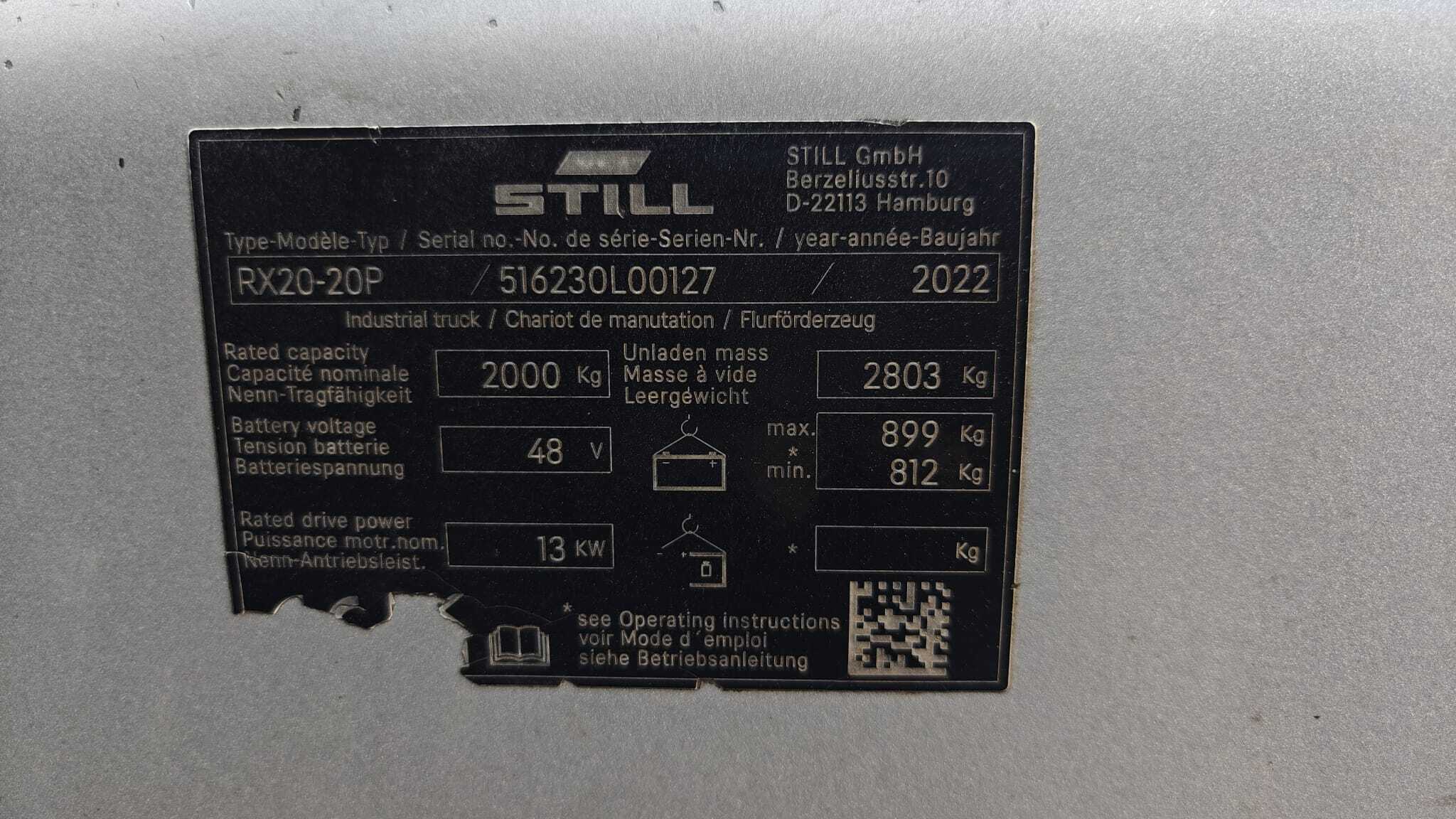 Still RX20-20P Load capacity: 2.000 Kg Lifting height: 5.080 mm Mast: Triplex Fork: 1.200 mm Build height: 2.260 mm Motorization: Electric Battery: 48v/625Ah Charger: 48 v Good condition, Battery condition 83%, Side-shift, 4 valve.