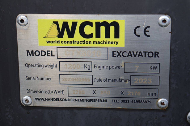 Brand: WCM Type: CTX8010 Serial number: 2023H02069 Year of construction: 2023 Fuel: Diesel Engine power: 7 KW Quick change: No Reading operating hours: 10 h Running gear: Tracks Machine weight: 1200 kg Color: green