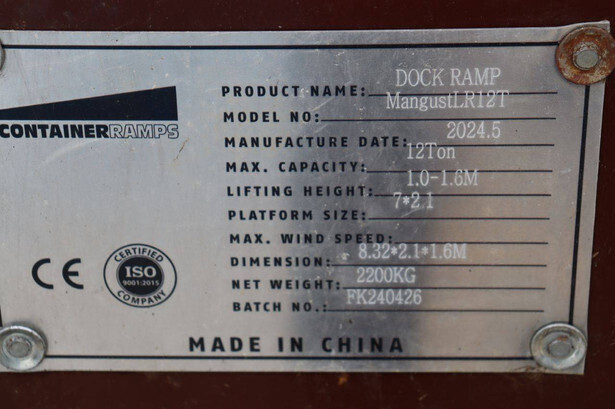 Brand: Containerramps Type: Mangust LR12T Serial number: FK240426 Year of construction: 2024 Load capacity: 12000 kg Number of axles: 1 Dimensions: 8.32x2.1x1.6m