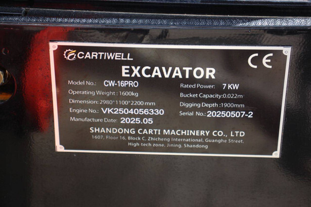 Brand: Cartiwell Type: CW-16PRO Serial number: VK2504056330 Year of construction: 2025 Fuel: Diesel Engine power: 7 kW Quick change: No Reading operating hours: 2 h Running gear: Tracks Machine weight: 1600 kg Color: red