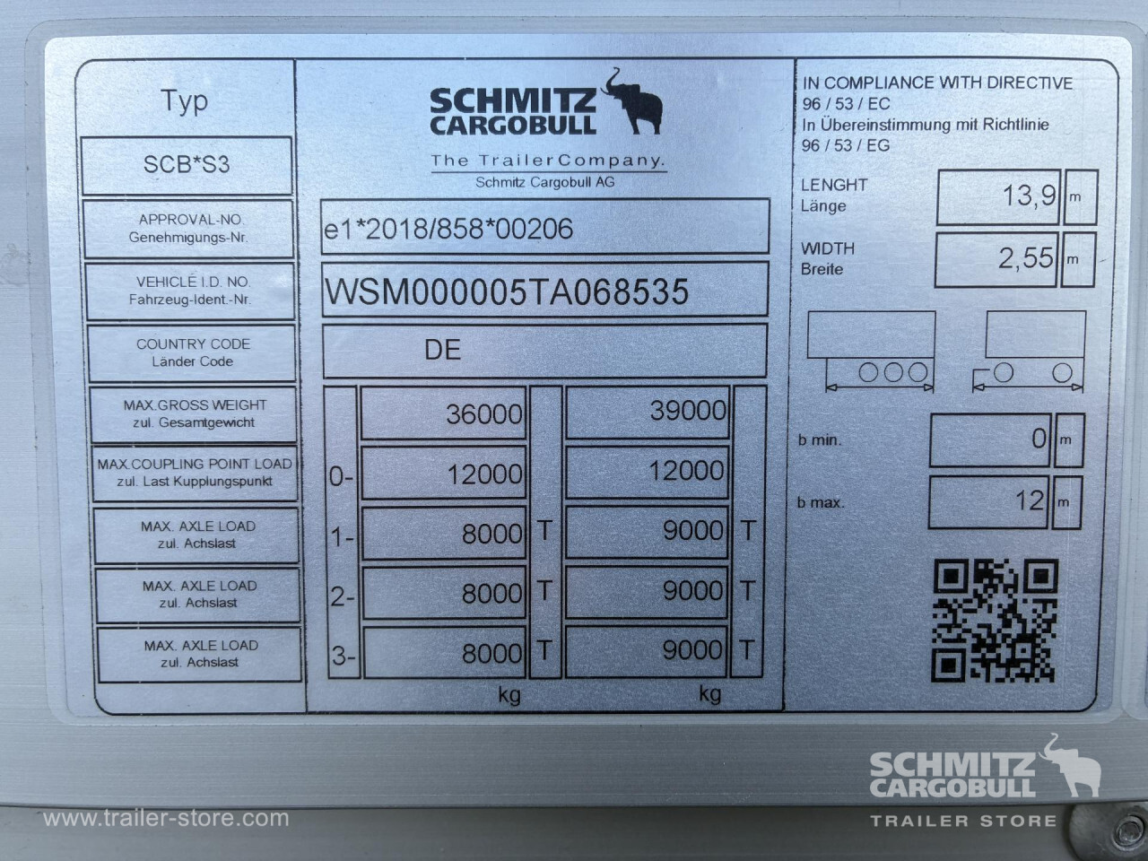 Remarks: **Safety**\\Rear underrun, Antilock Braking System ABS, Telematics system, Tyre pressure control\\\\**Exterior**\\Air suspension, Lift axle front, Bolted chassis, Gantry doors, 1x15 and 2x7 pin plug, Antispray, Lifting roof (manual), Impact buffer\\\\**Cargo securing**\\Cargo securing with certificate, DIN EN 12642 (code XL) certificate, DC 9.5 certificate, Beverage certificate, Punched load securing side rave, Pallet retaining rail\\\\**Brake system**\\Disc brake, Schmitz Cargobull\\\\**Floor**\\Wooden floor, Lashing rings in floor\\\\**Loading area**\\Length 13.620 mm, Width 2.480 mm, Height 2.950 mm, Volume 99 m³\\\\**Tyre sizes**\\1. Achse: 445/45 R19.5 , Tread depth: 15 mm / 15 mm, 2. Achse: 445/45 R19.5 , Tread depth: 15 mm / 15 mm, 3. Achse: 445/45 R19.5 , Tread depth: 15 mm / 15 mm\\\\**Other dimensions and weights**\\Payload: 29.520 kg, GVW: 36.000 kg\\\\----
