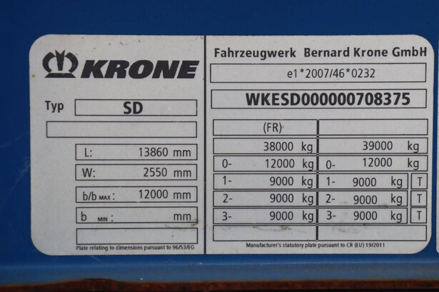 Brand: Krone Type: SD Chassis number: WKESD000000708375 MTM: 39000 kg Number of axles: 3 Brakes: Drum brakes Dimensions: 13860 x 2550 mm Odometer reading: 548946 KM