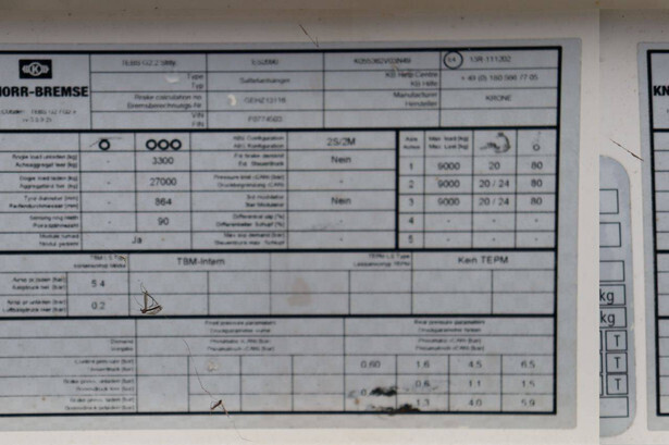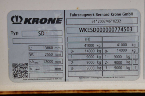 Brand: Krone Type: SD Chassis number: WKESD000000774503 Year of construction: Not known MTM: 41000 kg Number of axles: 3 Brakes: Disc brakes