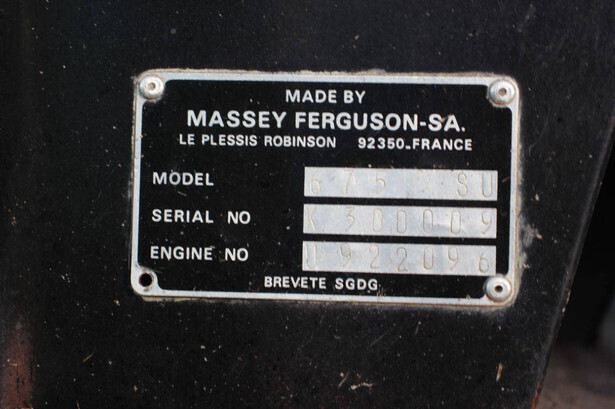 Brand: Massey Ferguson Type: MS675 Serial number: K 300009 Year of construction: 1984 Fuel: Diesel Engine power: 75 HP Engine Brand: Perkins Reading operating hours: 9988 h Weight: 3039 kg Tires: Pneumatic tires Color: red