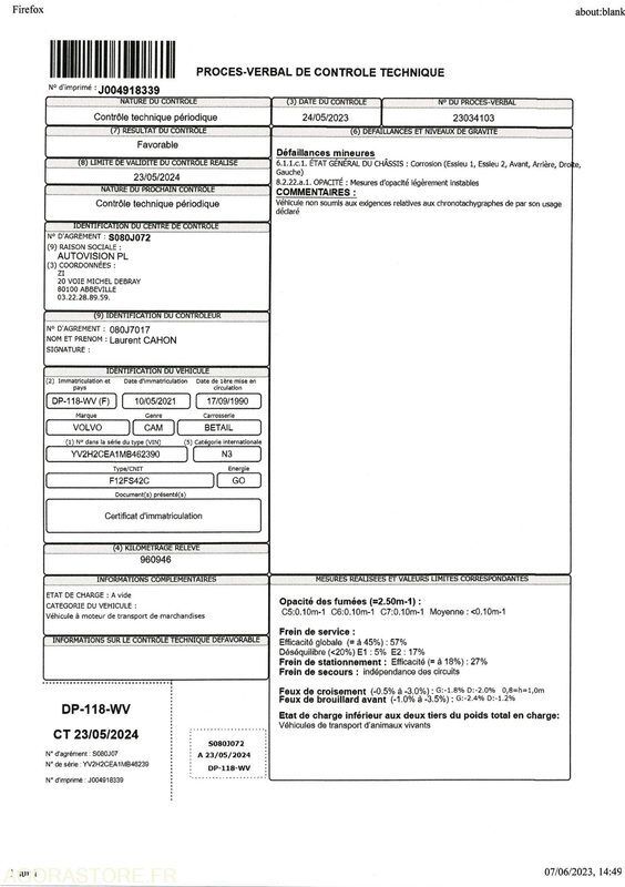 Volvo F12 Fuel: diesel FR: Date et lieu de visite: Services techniques sur RDV