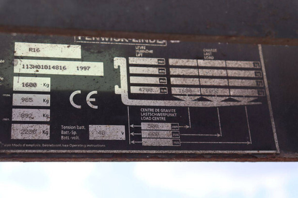 Brand: Linde Type: R16 Serial number: 113H01014816 Year of construction: 1997 Fuel: Electric Mast type: Triplex Sideshift: Yes Lifting capacity: 1600 kg Lifting height: 4790 mm Operating hours read: 10843 h Machine weight: 3220 kg Color: red