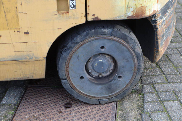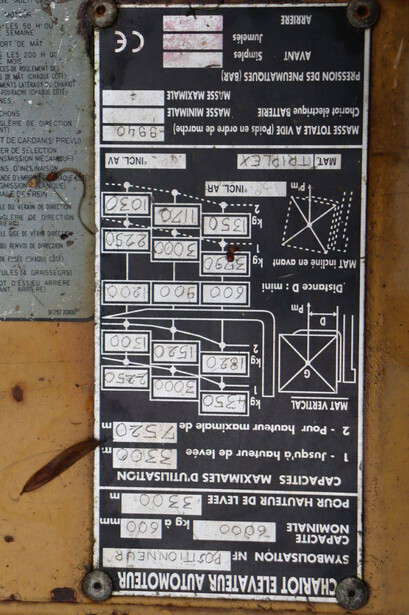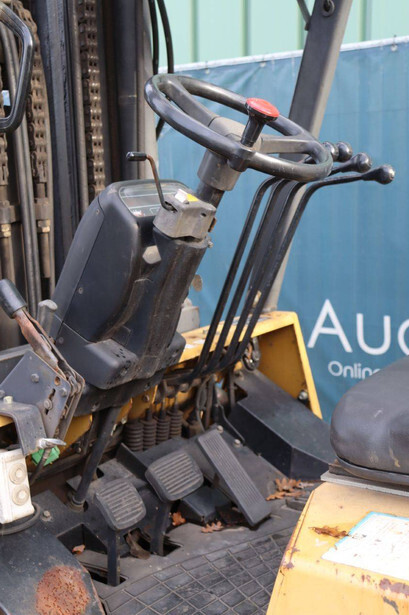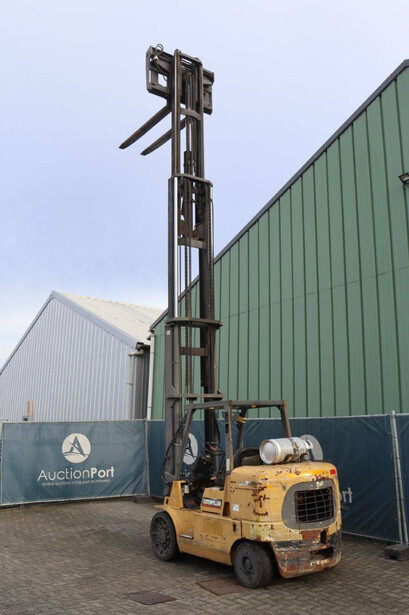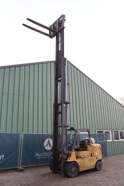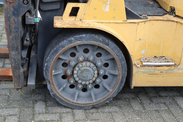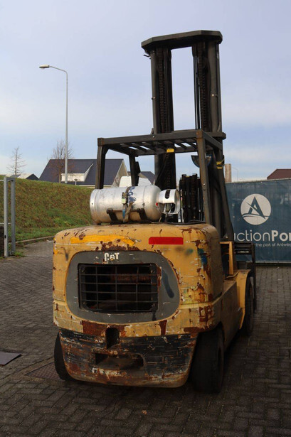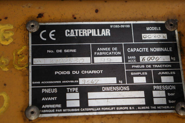 Brand: Caterpillar Type: GC60K Serial number: AT 8900530 Year of construction: 1999 Fuel: LPG Mast type: Triplex Sideshift: No Lifting capacity: 6000 kg Lifting height: 7520 mm Reading operating hours: 8099 h Machine weight: 9647 kg Tires: Solid tires Color: yellow
