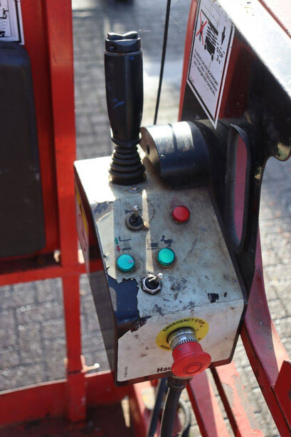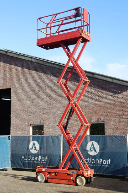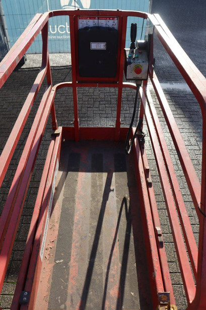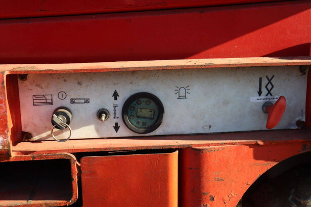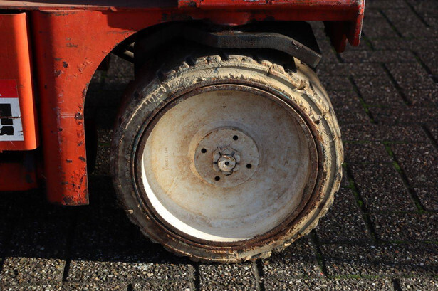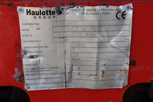 Brand: Haulotte Type: COMPACT 8 Serial number: CE100523 Year of construction: 2000 Fuel: Electric Lifting capacity: 350 kg Working height: 8 m Operating hours read: 988 h Machine weight: 1730 kg Chassis: Wheels Type: Scissor lift Tires: Solid tires Color: orange