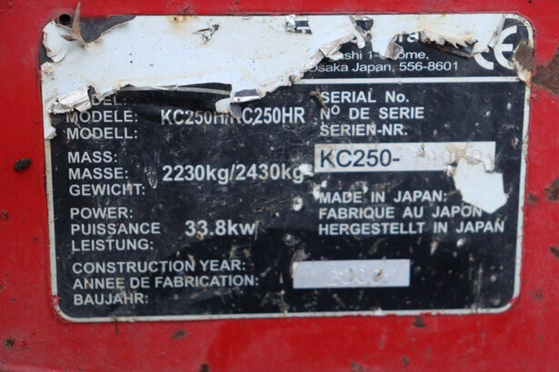 Brand: Kubota Type: KC250HR Serial number: KC250-100 Year of construction: 2000 Fuel: Diesel Engine power: 33.8 Load capacity: 2500 kg Operating hours read: 3617 h Machine weight: 2230 kg Running gear: Tracks Color: red