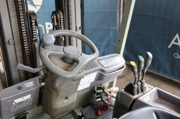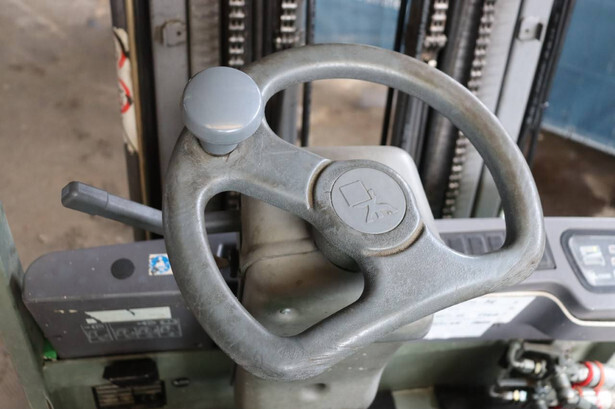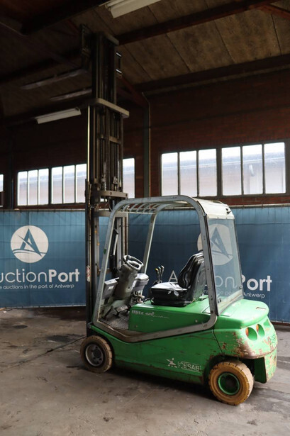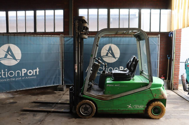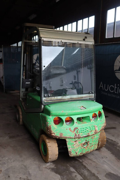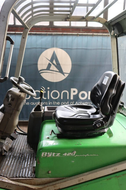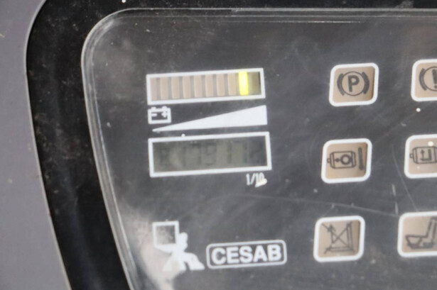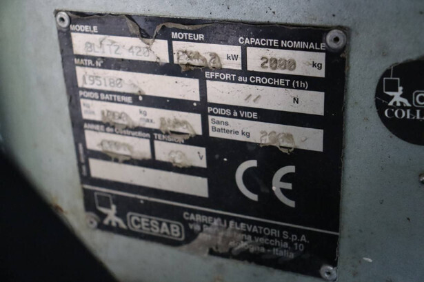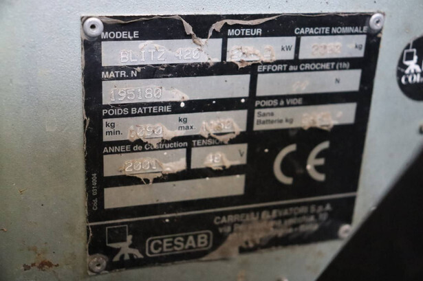 Brand: CESAB Type: Blitz 420 Serial number: 195180 Year of construction: 2001 Fuel: Electric Mast type: Triplex Sideshift: No Lifting capacity: 2000 kg Lifting height: Not known Operating hours read: 17917 h Machine weight: 2665 kg Tires: Non-marking tires Color: green