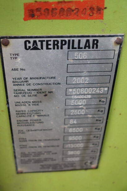 Brand: Caterpillar Type: 506 Serial number: 50600243 Year of construction: 2002 Fuel: Diesel Engine power: 64.0 kW Lifting capacity: 2500 kg Operating hours read: 3995 h Machine weight: 5000 kg Tires: Pneumatic tires Color: green
